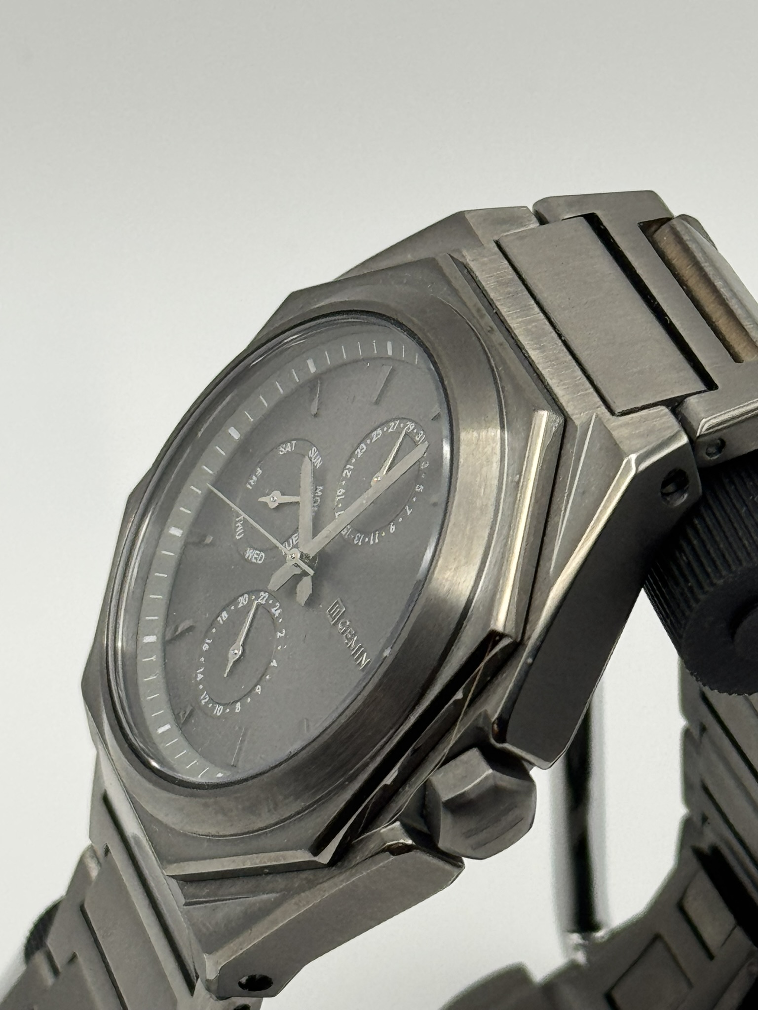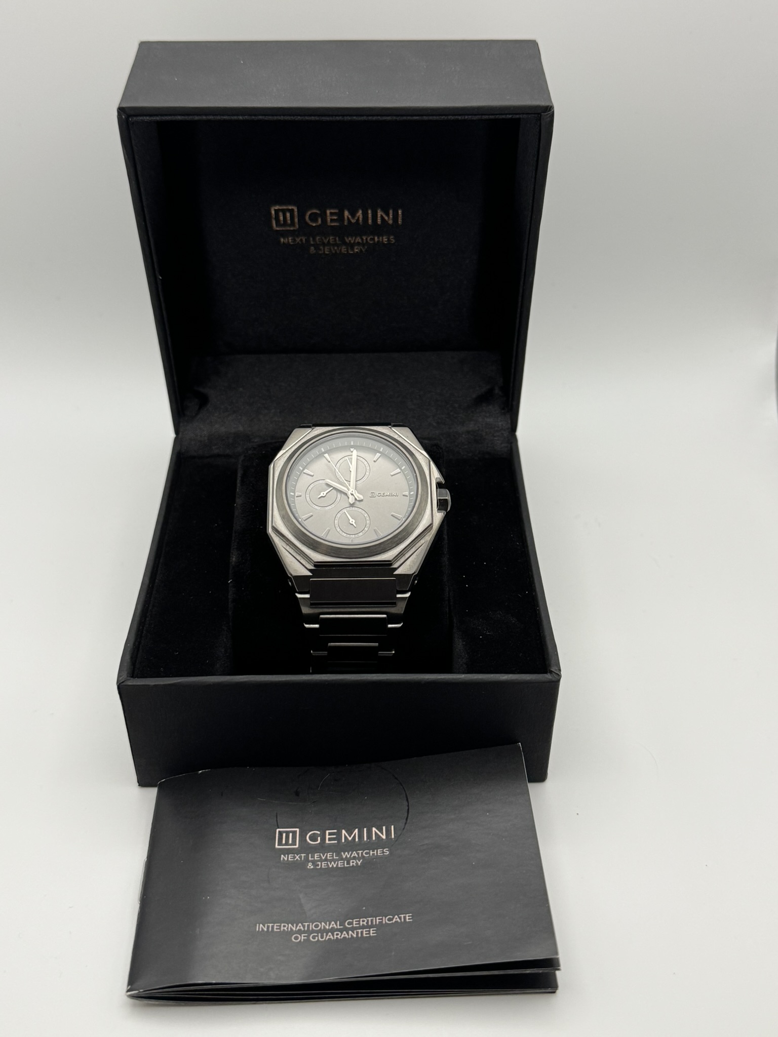 The Gemini Ferro Night is a stylish quartz wristwatch designed for men with a sleek stainless steel bracelet band. This water-resistant timepiece features stick indexes, a solid caseback, and comes with its original box and manual. With a 42mm case size and a range of useful features including a date indicator, day/night indicator, and 12-hour dial, this Gemini watch is perfect for everyday wear. The classic design and quality construction make it a versatile choice for any watch enthusiast.