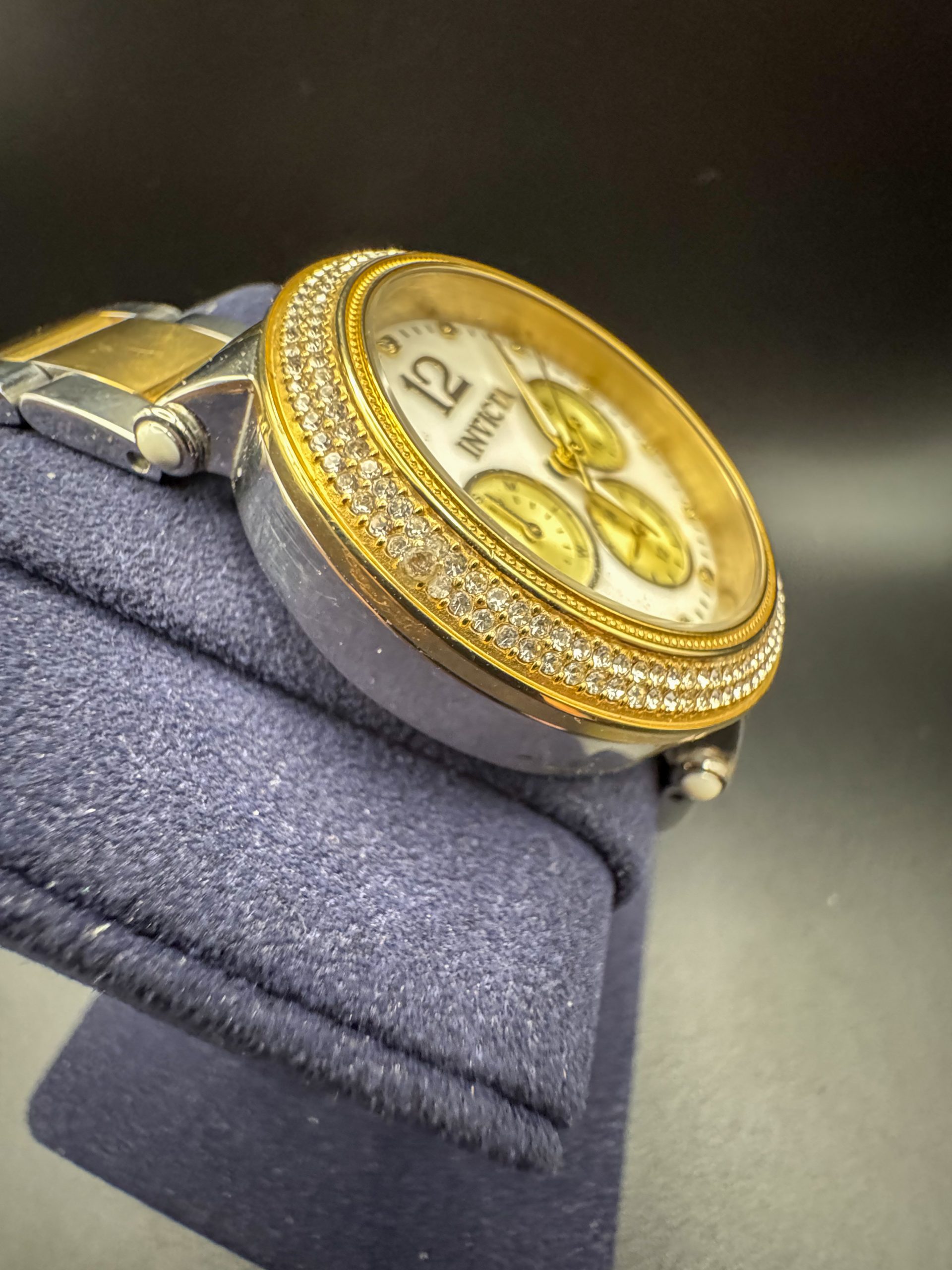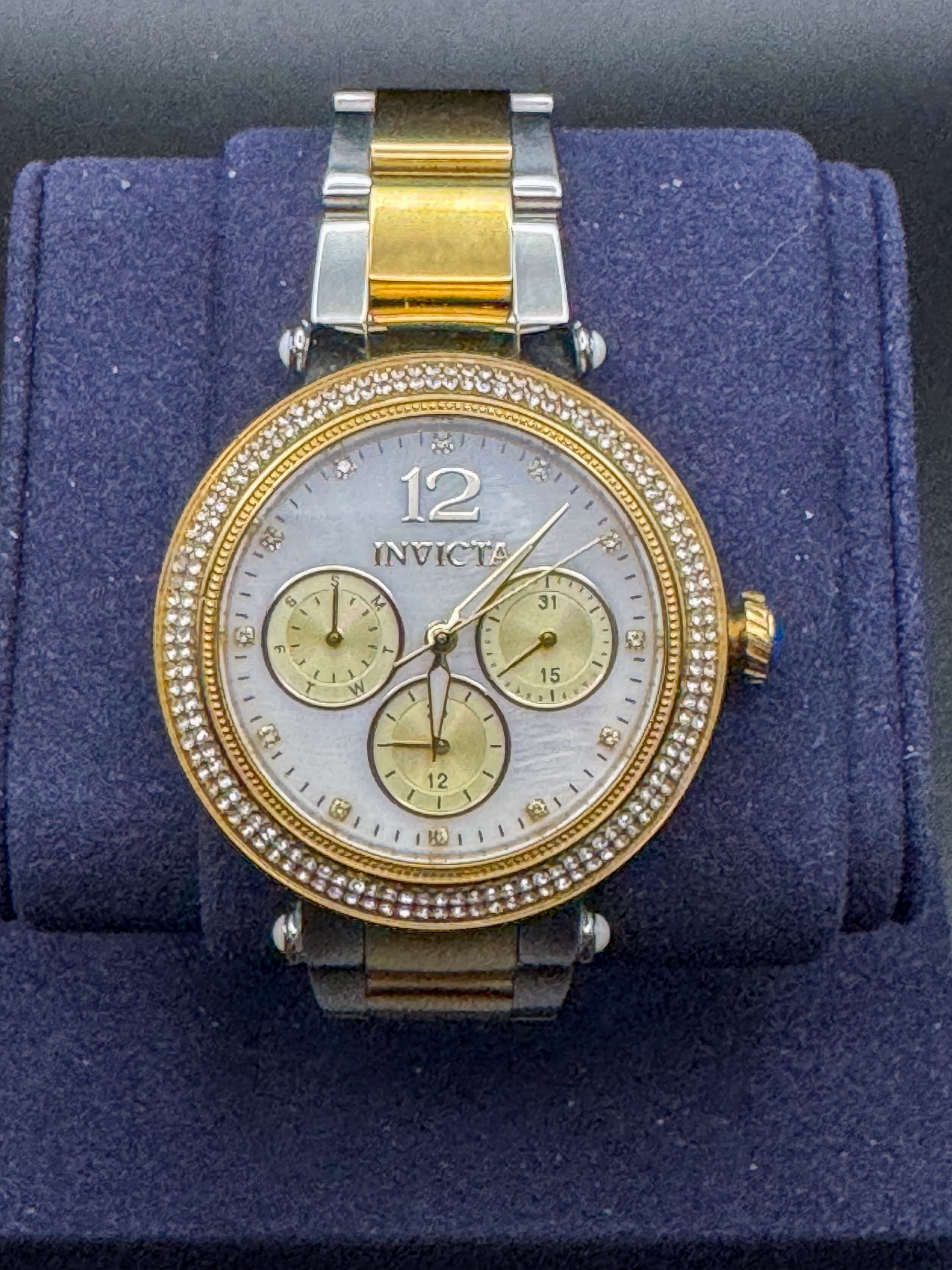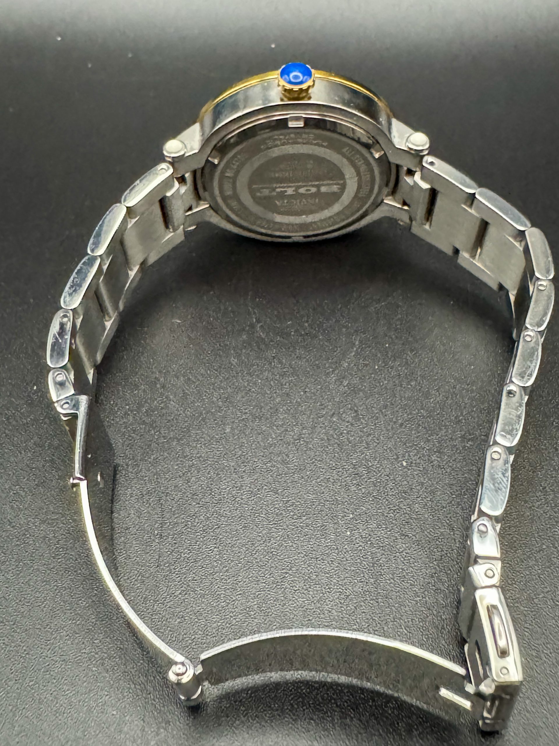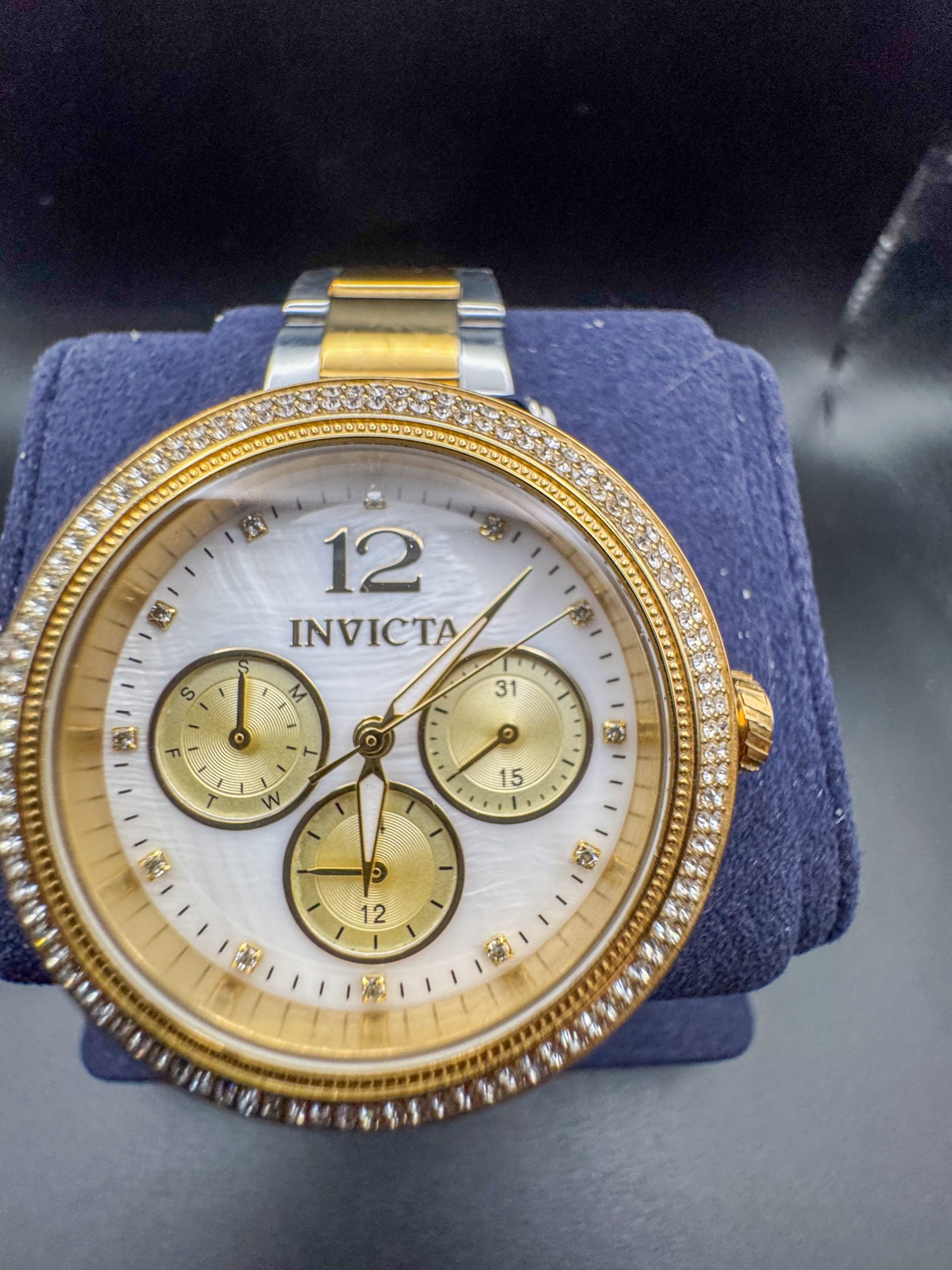 The Invicta Bolt Women’s Watch (Model 44705) is a stylish timepiece featuring a stainless steel band and caseback with a sleek screwback design. The watch has a classic analog quartz movement with a date indicator, perfect for everyday wear. With a water resistance of 100m (10 ATM), this watch is not only functional but also durable for various activities. The unique Mother of Pearl dial with arrow markers adds a touch of elegance to this pilot/aviator-inspired timepiece from Invicta.
