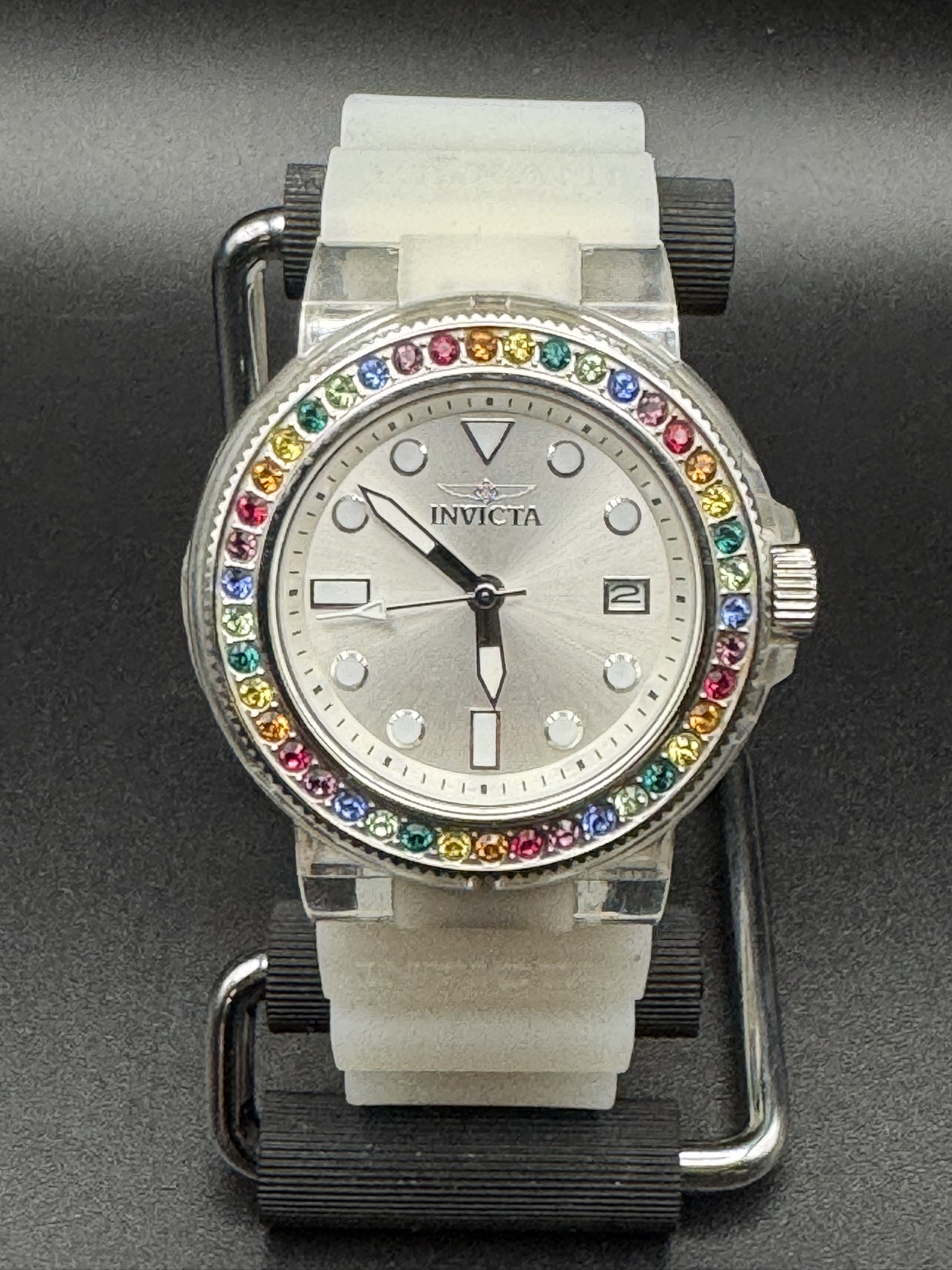 - Rainbow Jeweled Bezel: The standout feature is a stainless steel bezel adorned with 6 colorful jewels (2.00mm each) in shades of blue, green, orange, yellow, red, and purple.