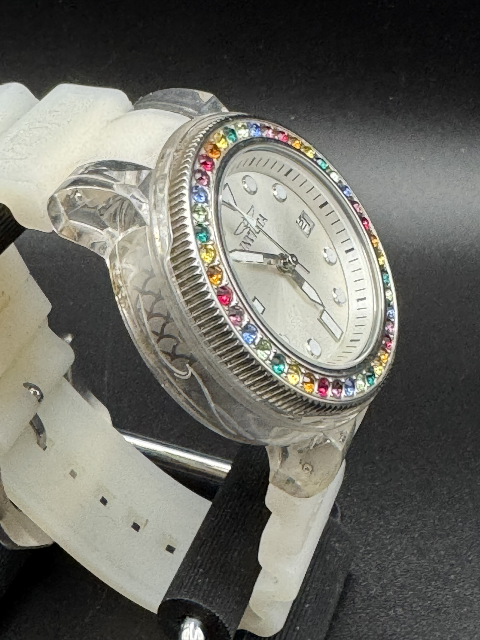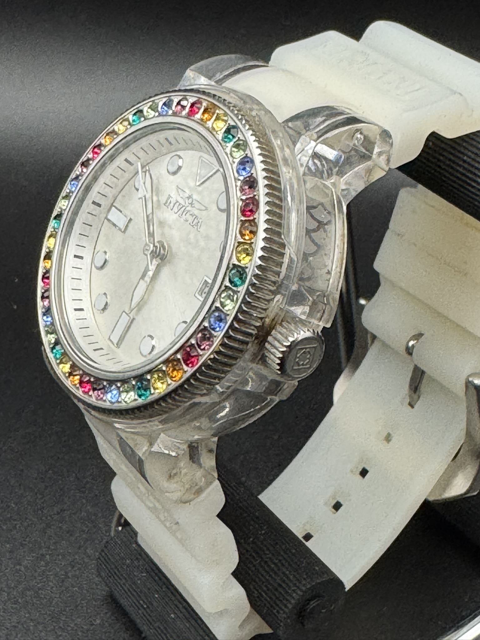 is a vibrant and durable women’s timepiece that blends sporty performance with a playful “rainbow” aesthetic. It is designed for those who want a reliable everyday watch that stands out with its unique multi-colored jeweled bezel and crisp white design.