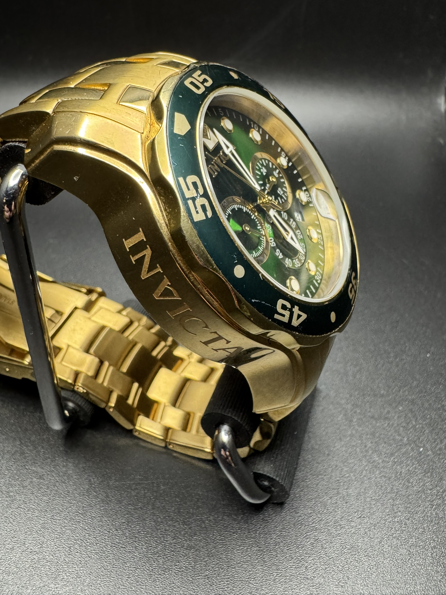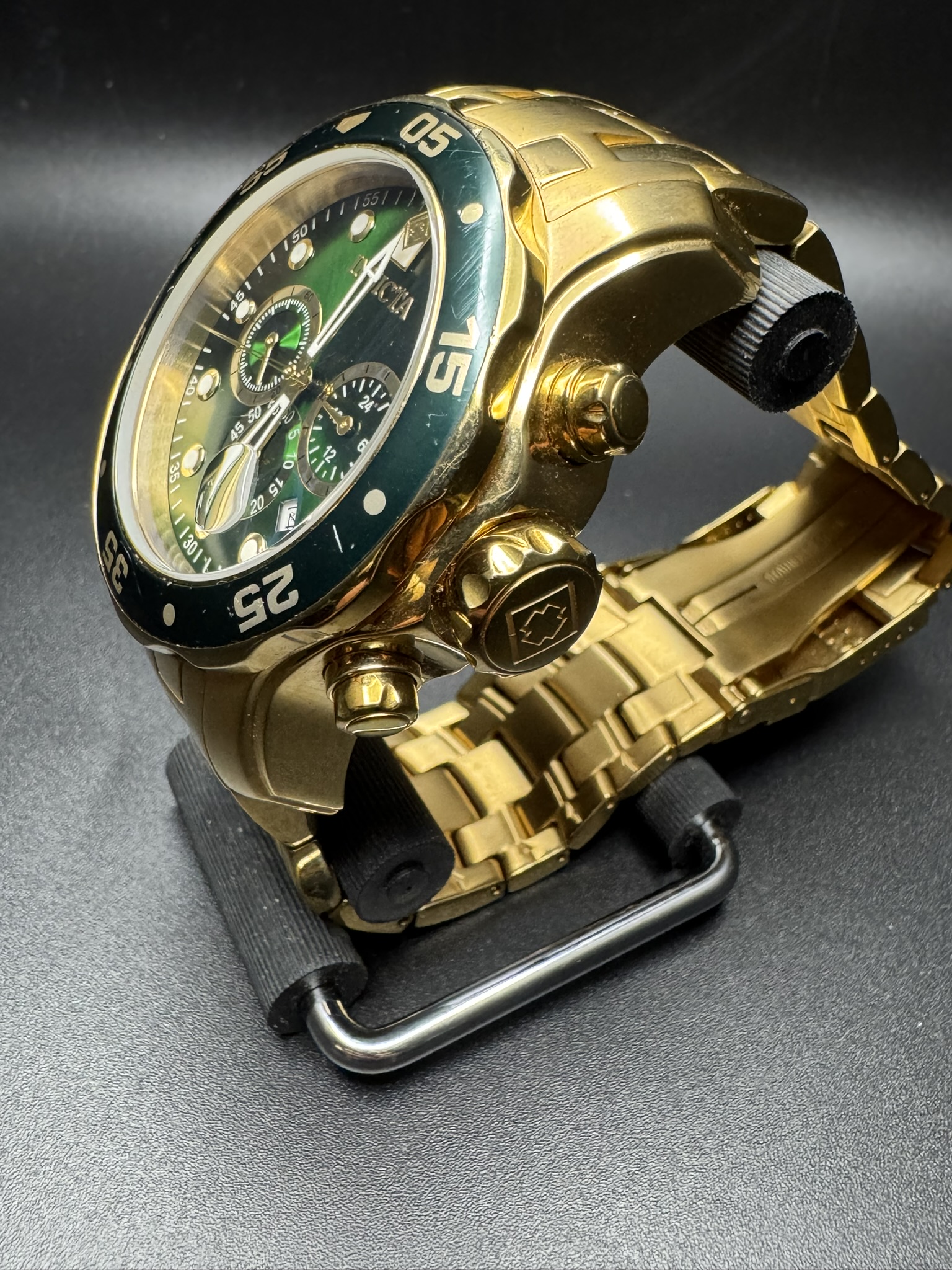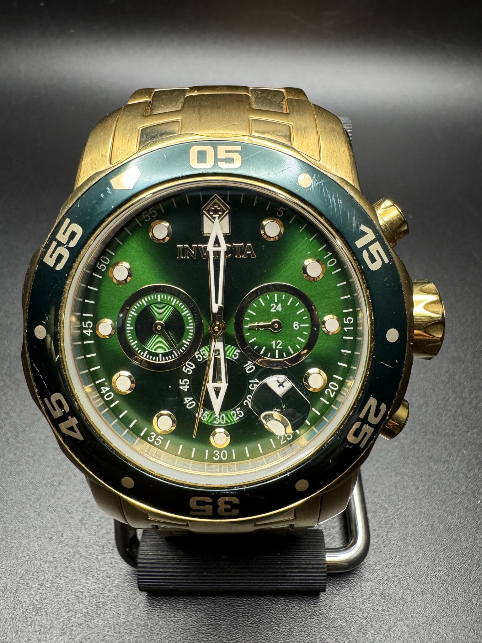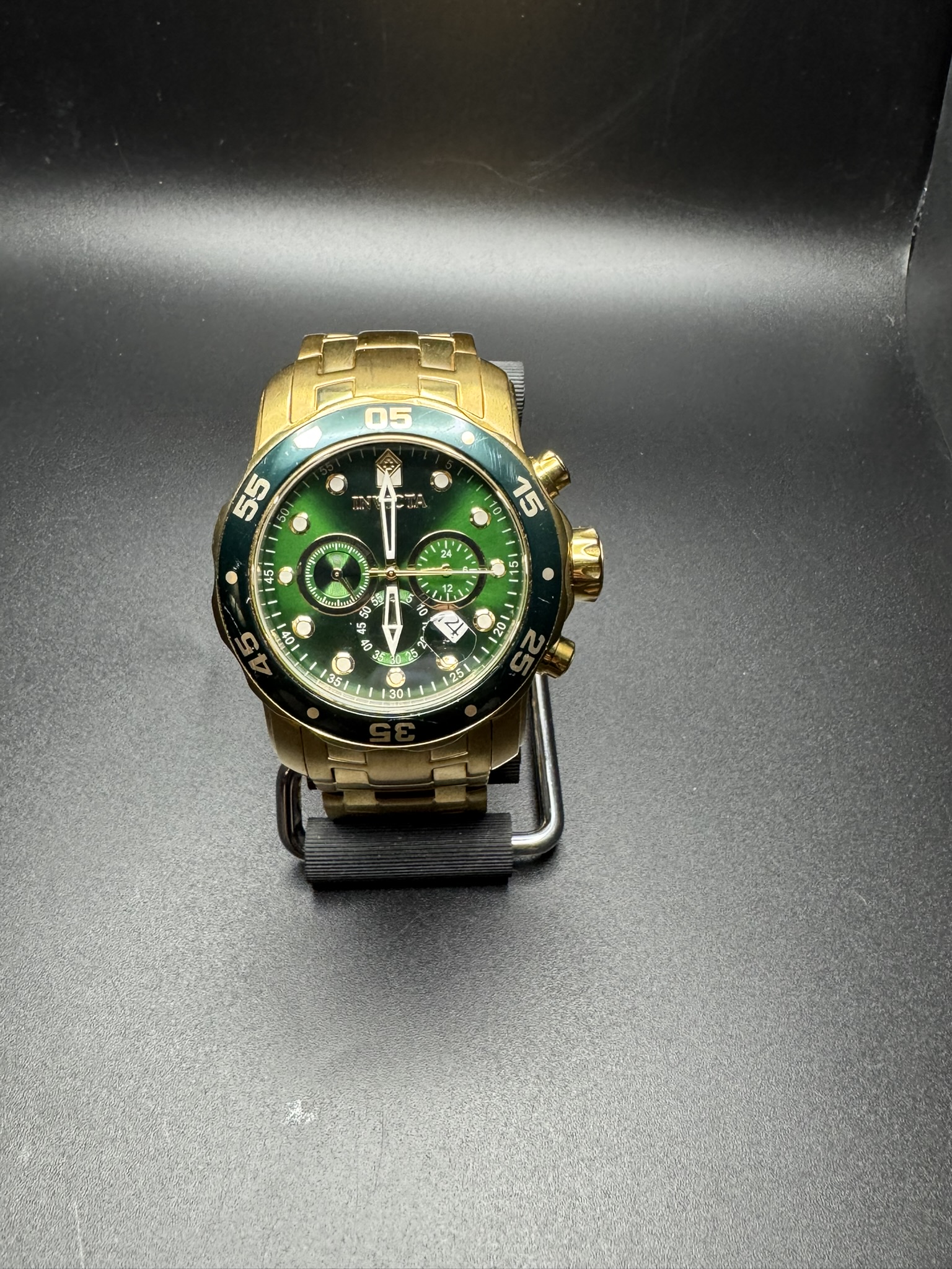 The Invicta Men’s Pro Diver Chronograph Watch (Model 0075) is a bold, oversized timepiece known for its striking “Hulk-style” green and gold color scheme. It features an 18kt gold-plated stainless steel case and bracelet paired with a vibrant sunray green dial.