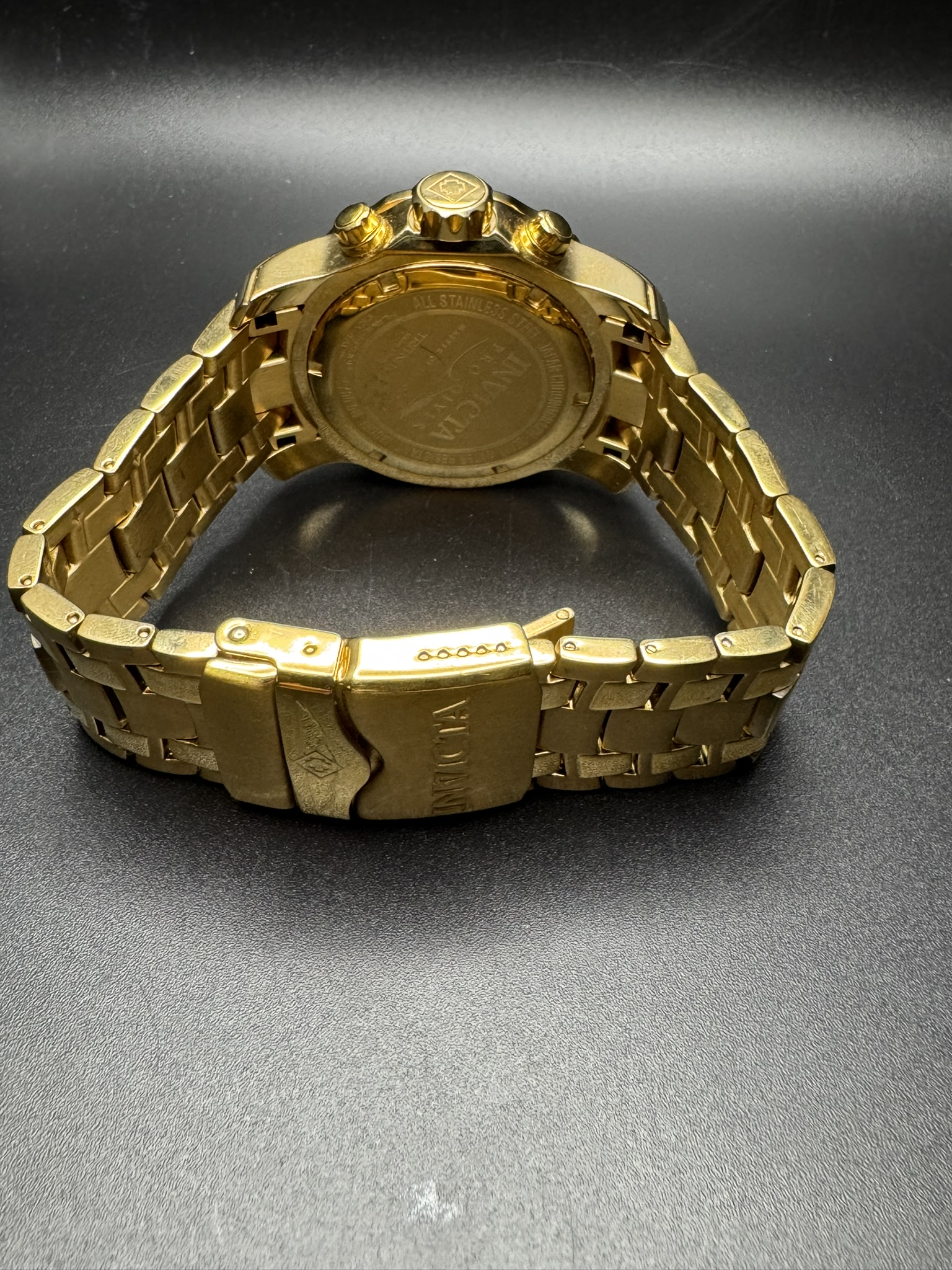 - Bracelet: 26mm wide gold-plated stainless steel band with a secure fold-over safety clasp.