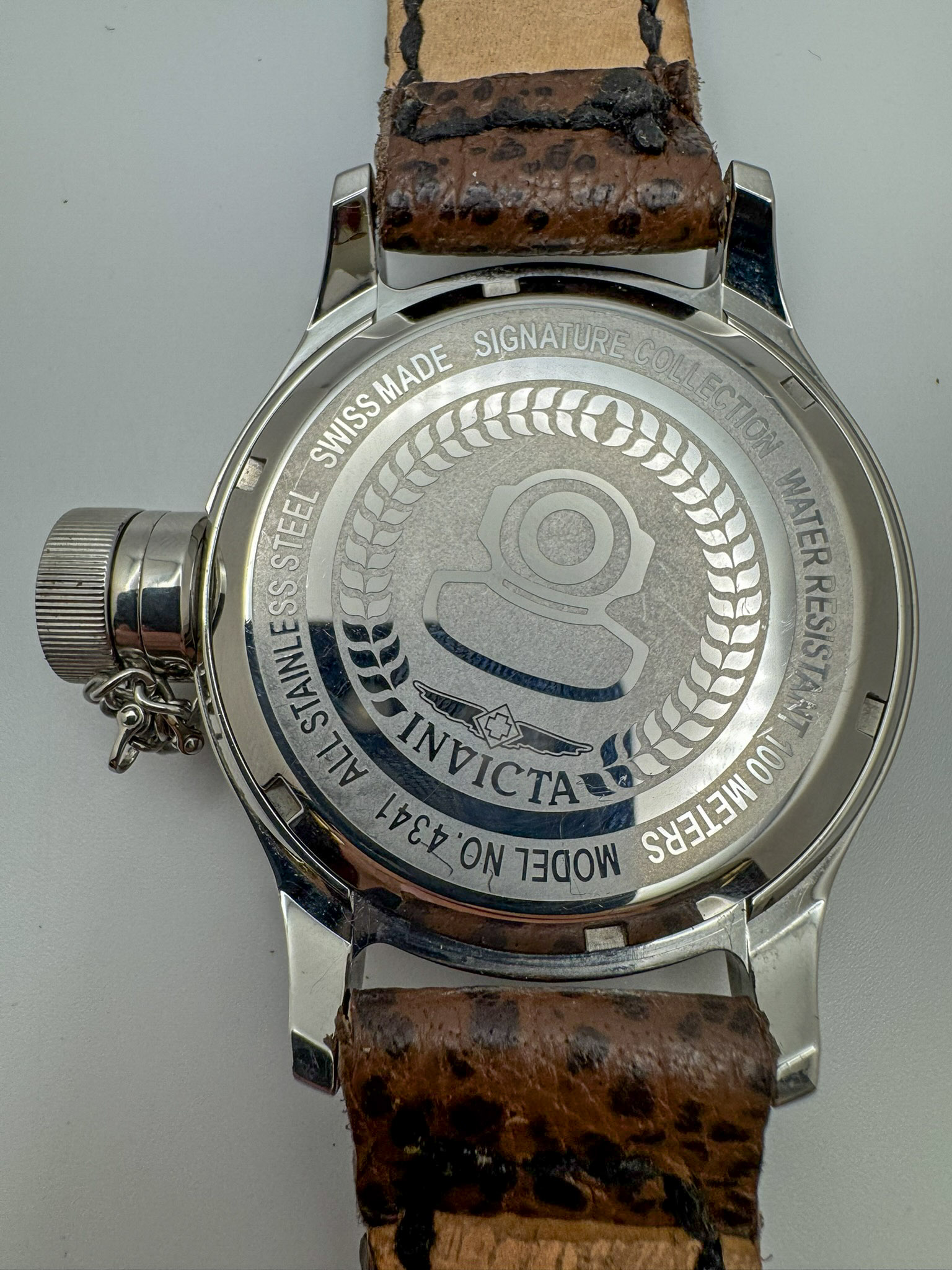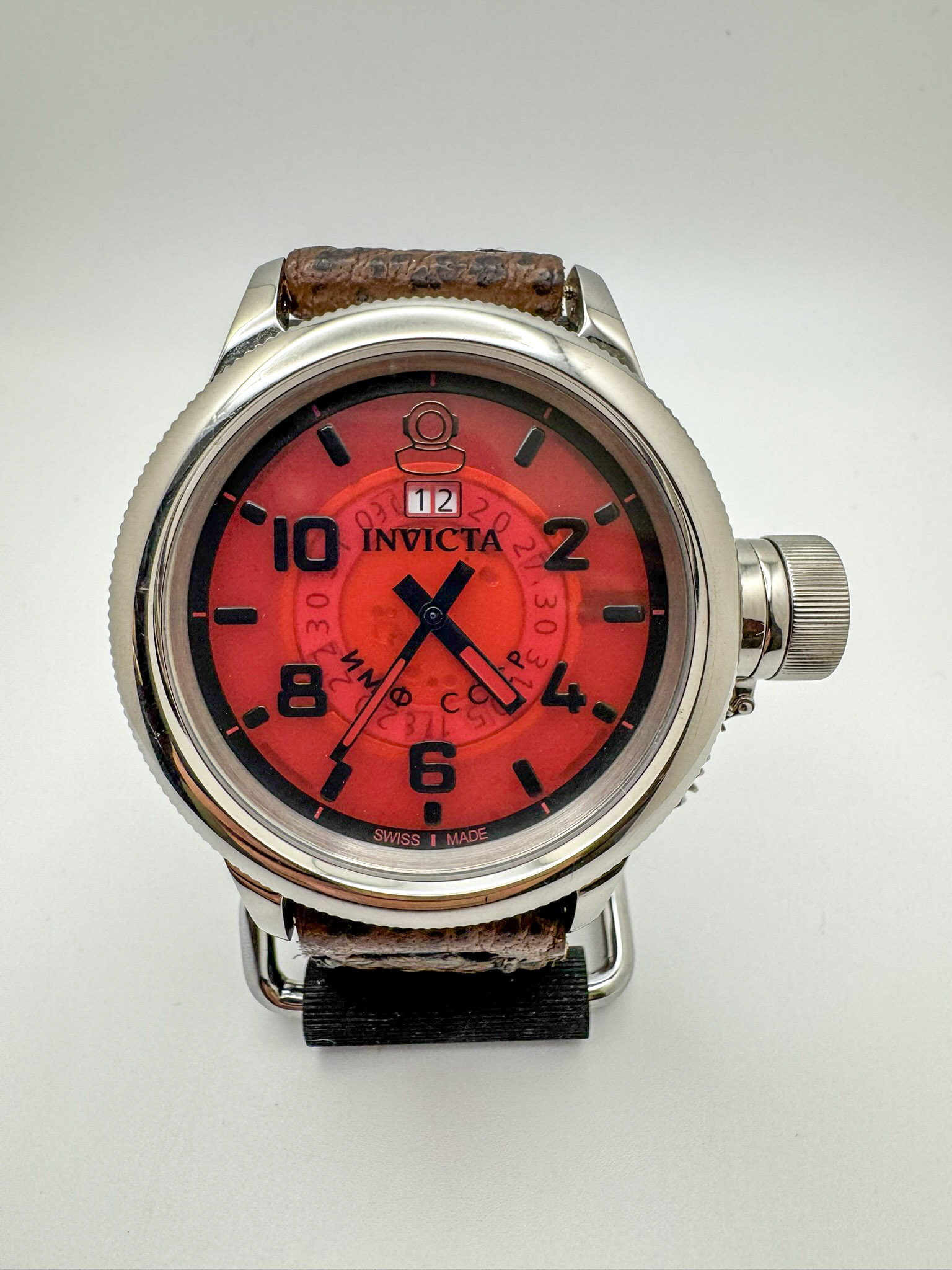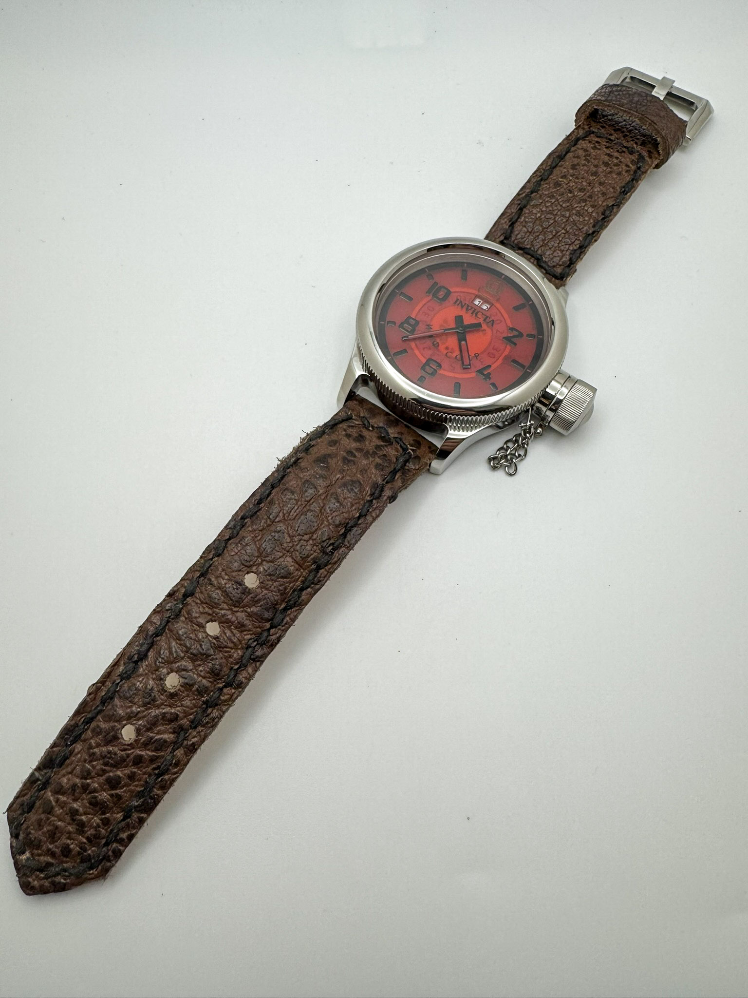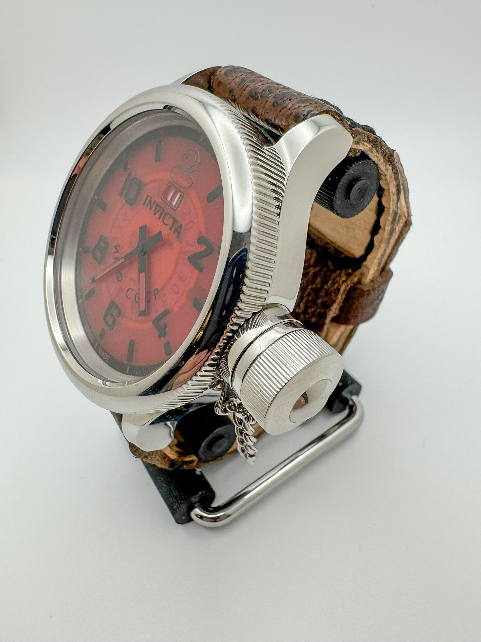 This Invicta Russian Diver (Model 4341) takes the bold, industrial aesthetic of the original and elevates it with a high-end, rugged transformation. While the factory rubber strap is standard, this specific timepiece has been upgraded with a one-of-a-kind, hand-stitched Water Buffalo leather strap.