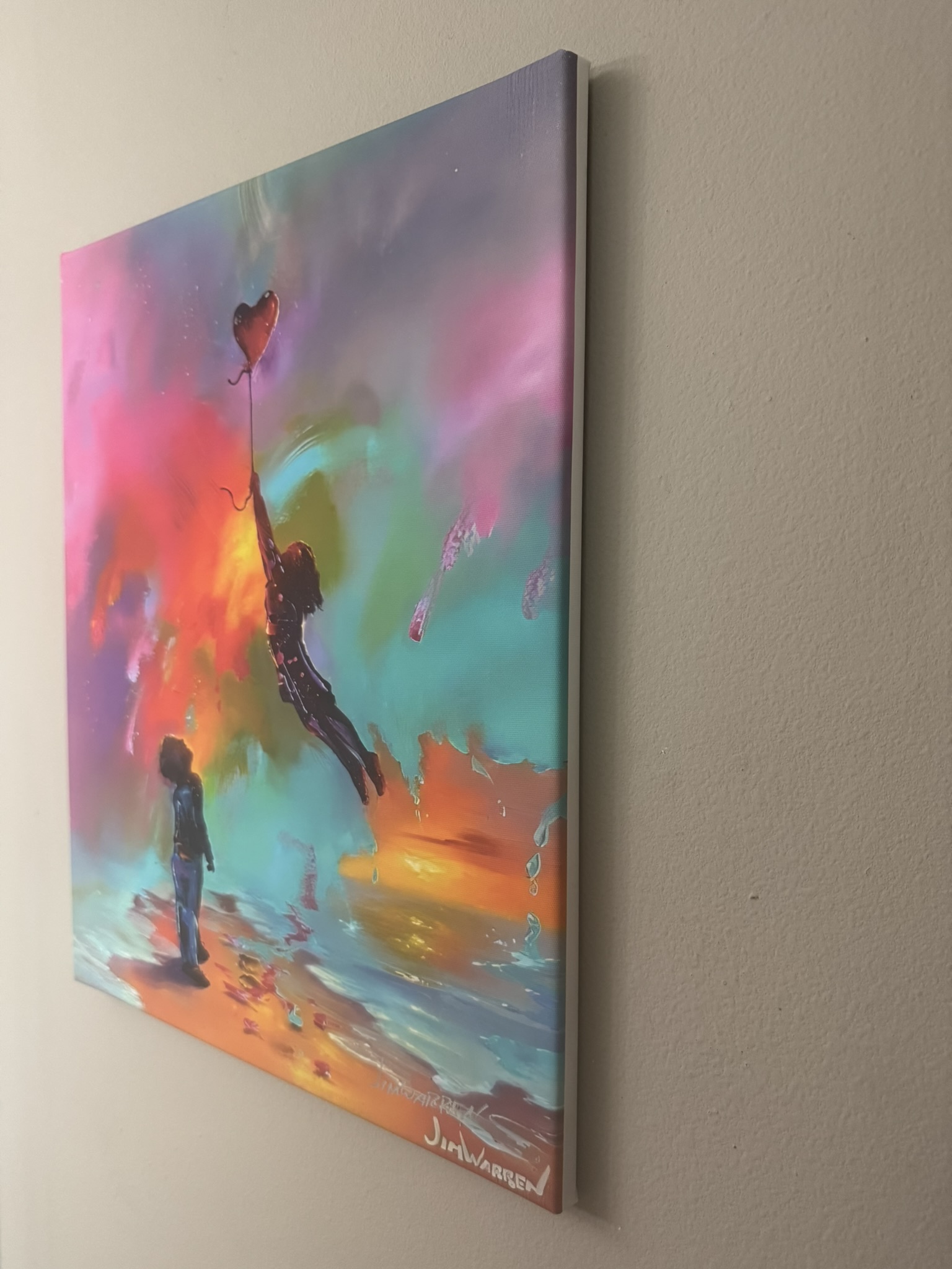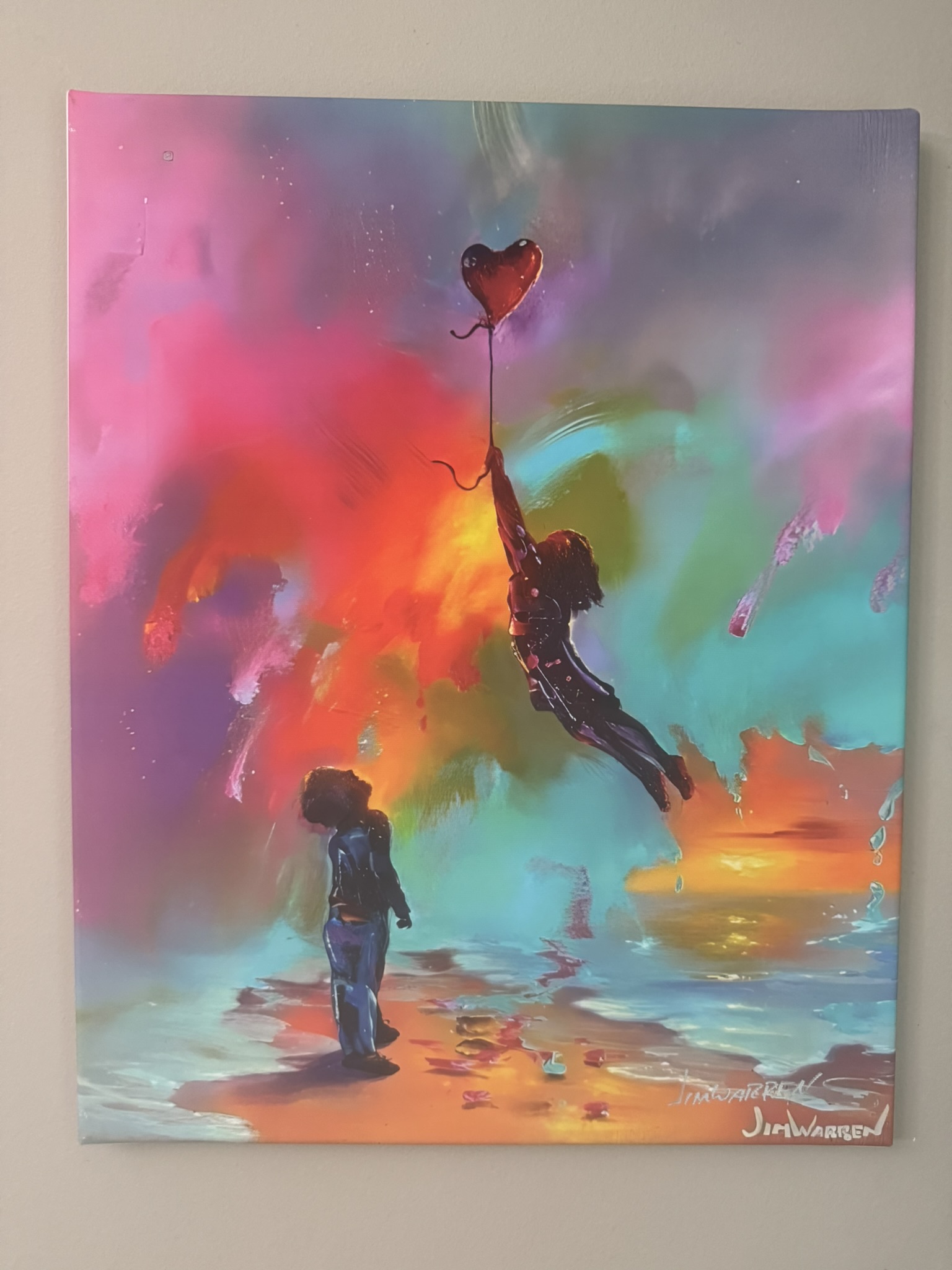 The artwork “Love and Joy to the World” by Grammy-winning artist Jim Warren is a vibrant expression of Neo-Surrealism designed to evoke peace and positive change. Known for his “Dream Maker” style, Warren created this piece as a remedy for the “misery in the world,” inviting viewers to share compassion generously. This piece exhibits the artist’s signiture! This piece is a giclée stretched on wood bars and measures 20×16.