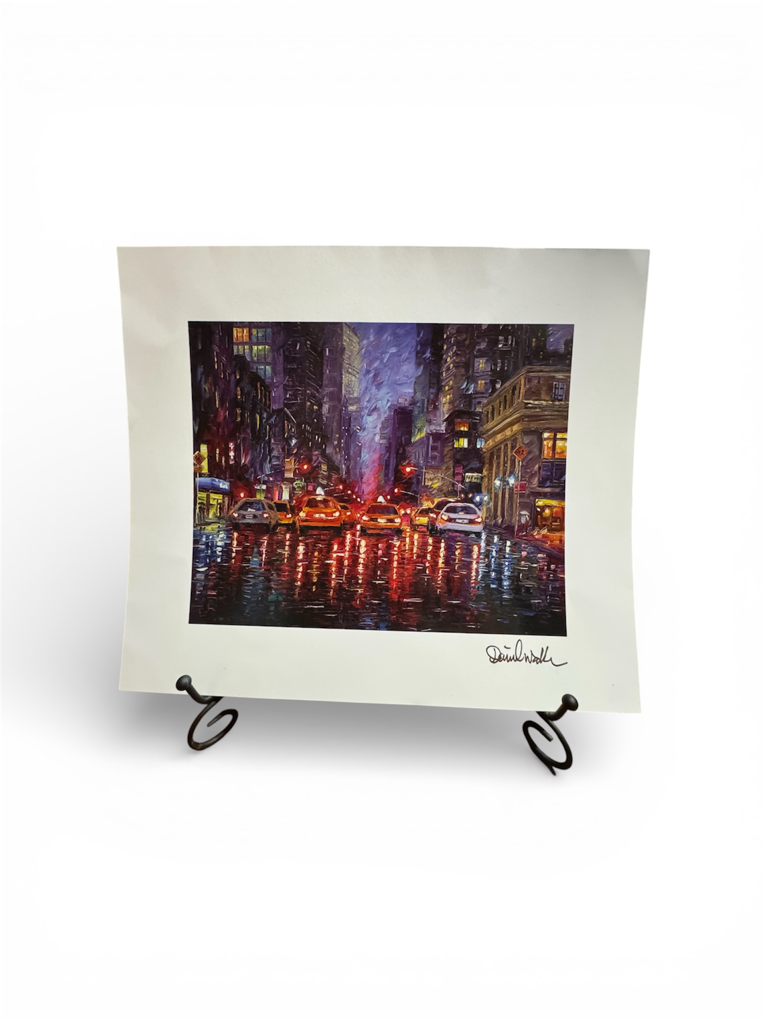 “Rainy Manhattan Night” by Daniel Wall is a striking example of “Intense Impressionism,” a contemporary style pioneered by the artist to bring the traditional 19th-century movement into the modern era. This 2024 lithograph captures a rain-soaked New York City street, transforming a bustling urban scene into a vibrant display of shimmering light and reflection.