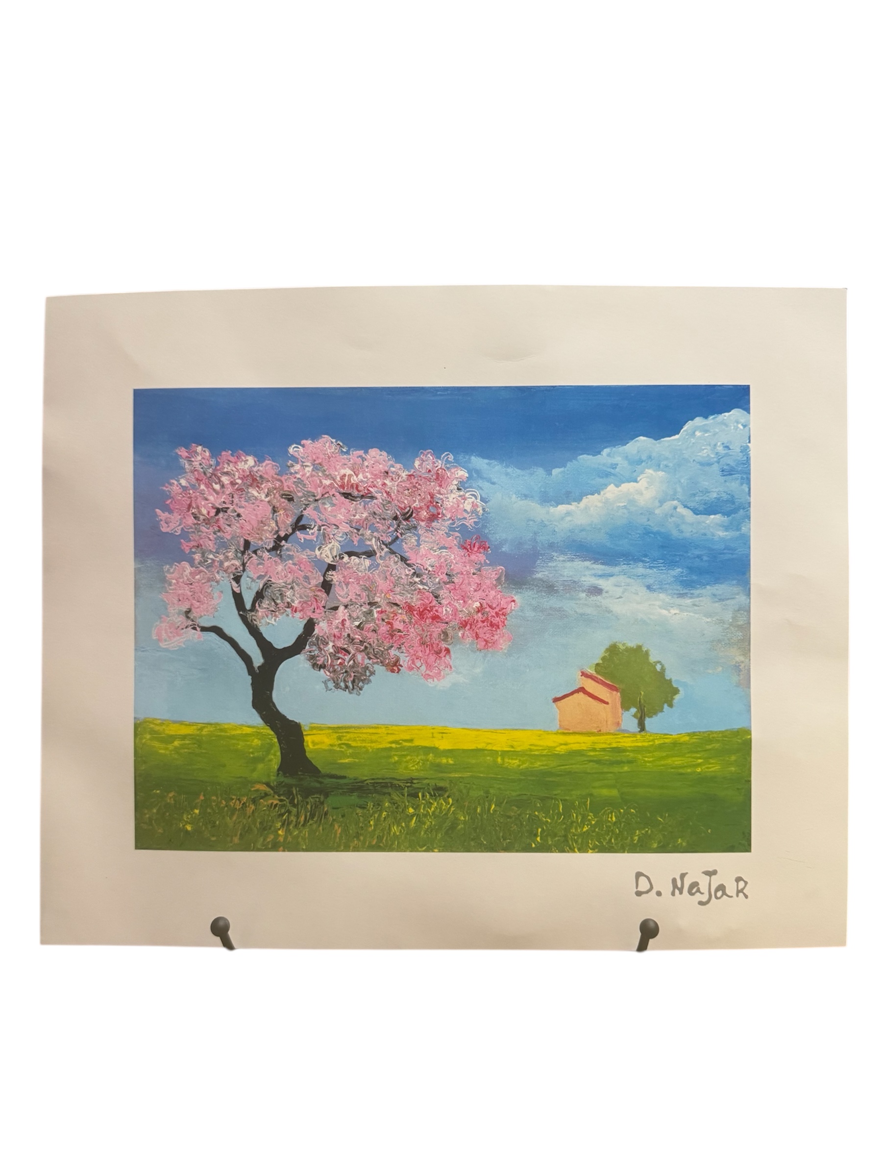 “Rural Home” by acclaimed contemporary artist David Najar is a serene and vibrant lithograph that captures the essence of a peaceful countryside. This 2021 piece features a signature Najar landscape—a lush, open field anchored by a magnificent pink-blossomed tree, with a quaint home resting under a deep blue sky.